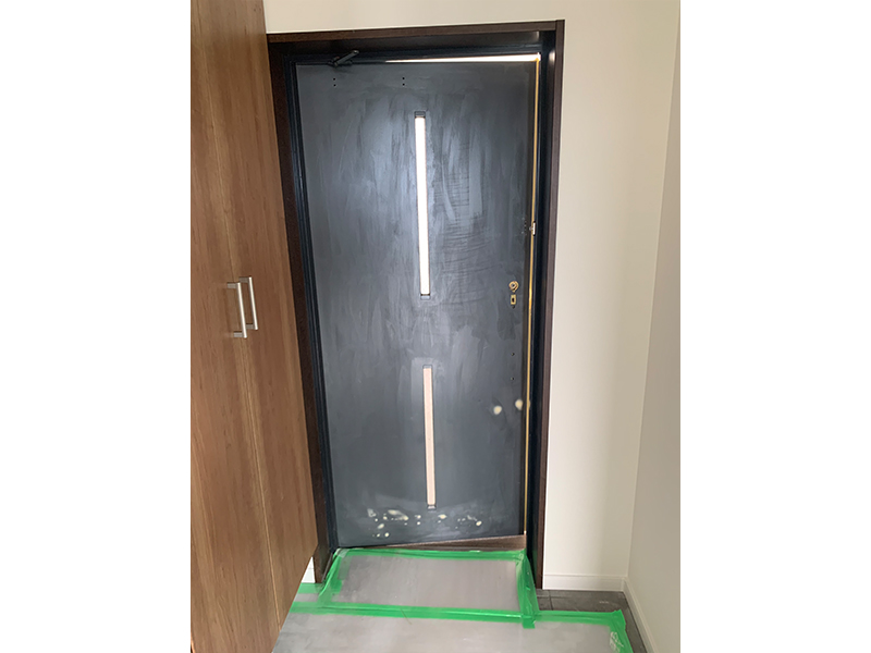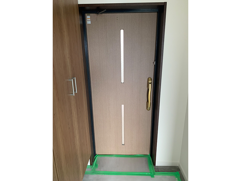 使用品種:3M 玄関ドアリフォームシート 使用効果:リフォーム工事に伴い、玄関ドアを新品に交換すると高額になる為、既存のドアに直接貼れるドア用シート(木目調)です。多少の凹みの等はパテ処理して平面にしたあとペーパーで均して貼り付けます。ドア用シートは、直射日光の熱にも強く施工後のシートの浮きなども見られず耐候性にも優れた製品になります。