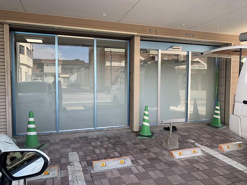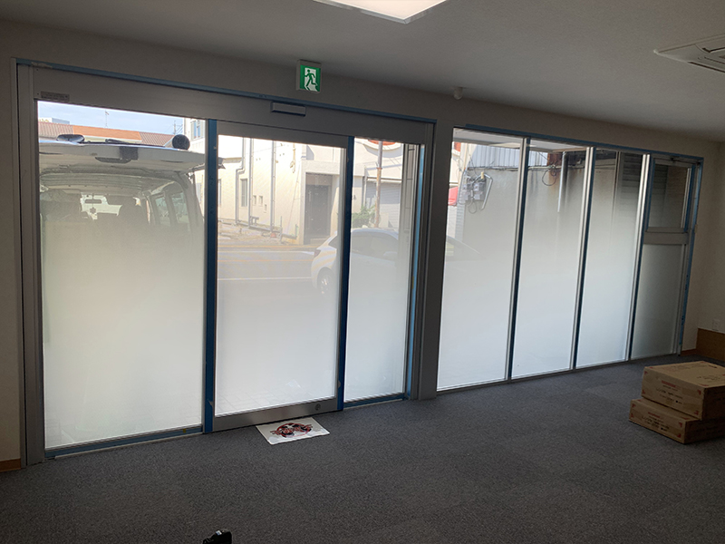 使用品種:3M イルミナシルキーW 使用効果:目隠し、装飾、中央は濃く上下が透明になっていくセンターグラデーションフィルムです。人通りの多い道路沿いでも店舗内を程よく目隠しできて、室内側から見ても人の動きをしっかりと確認することができます。