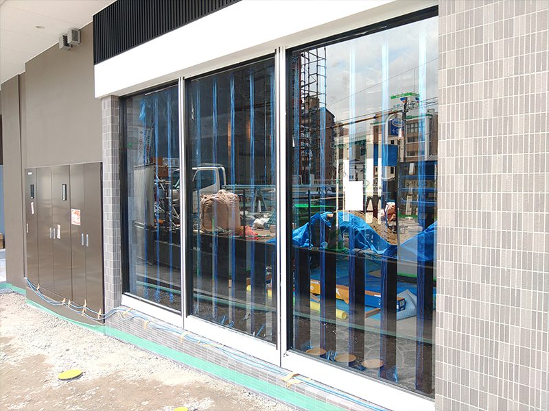 使用効果:装飾、目隠し、マンションエントランスへの施工です。 写真の通り、硝子と障害物の間に10cmから20cm隙間があればフィルムを施工することができます。